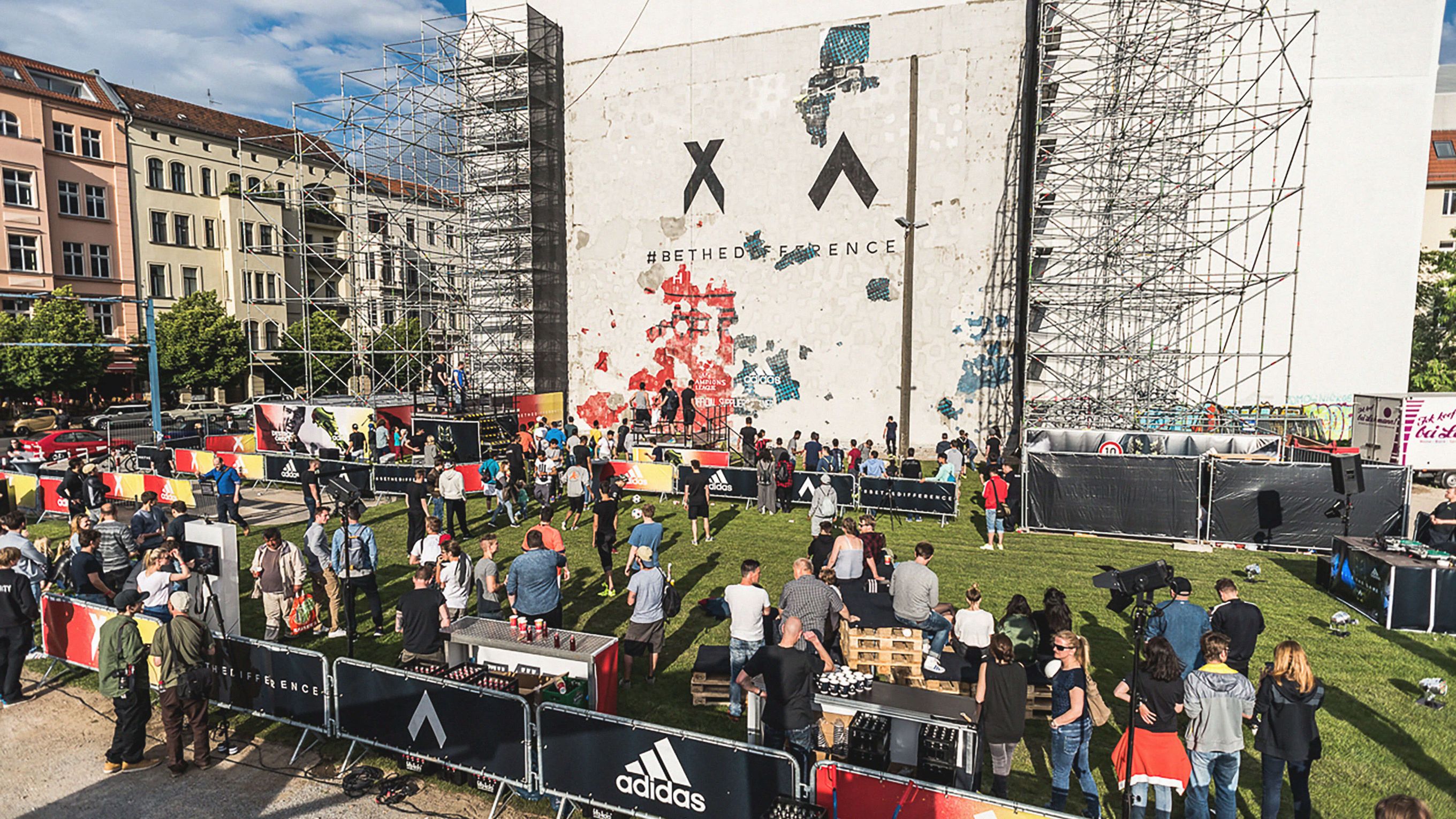 Adidas' "Be the difference" campaign, during the Champions League, was in full swing when our client approached us with a special idea. Brave as we were, we accepted the challenge that no one else would. The idea: to hit a plastered wall with footballs during an activation event so that the plaster crumbles and a campaign motif behind it is exposed.