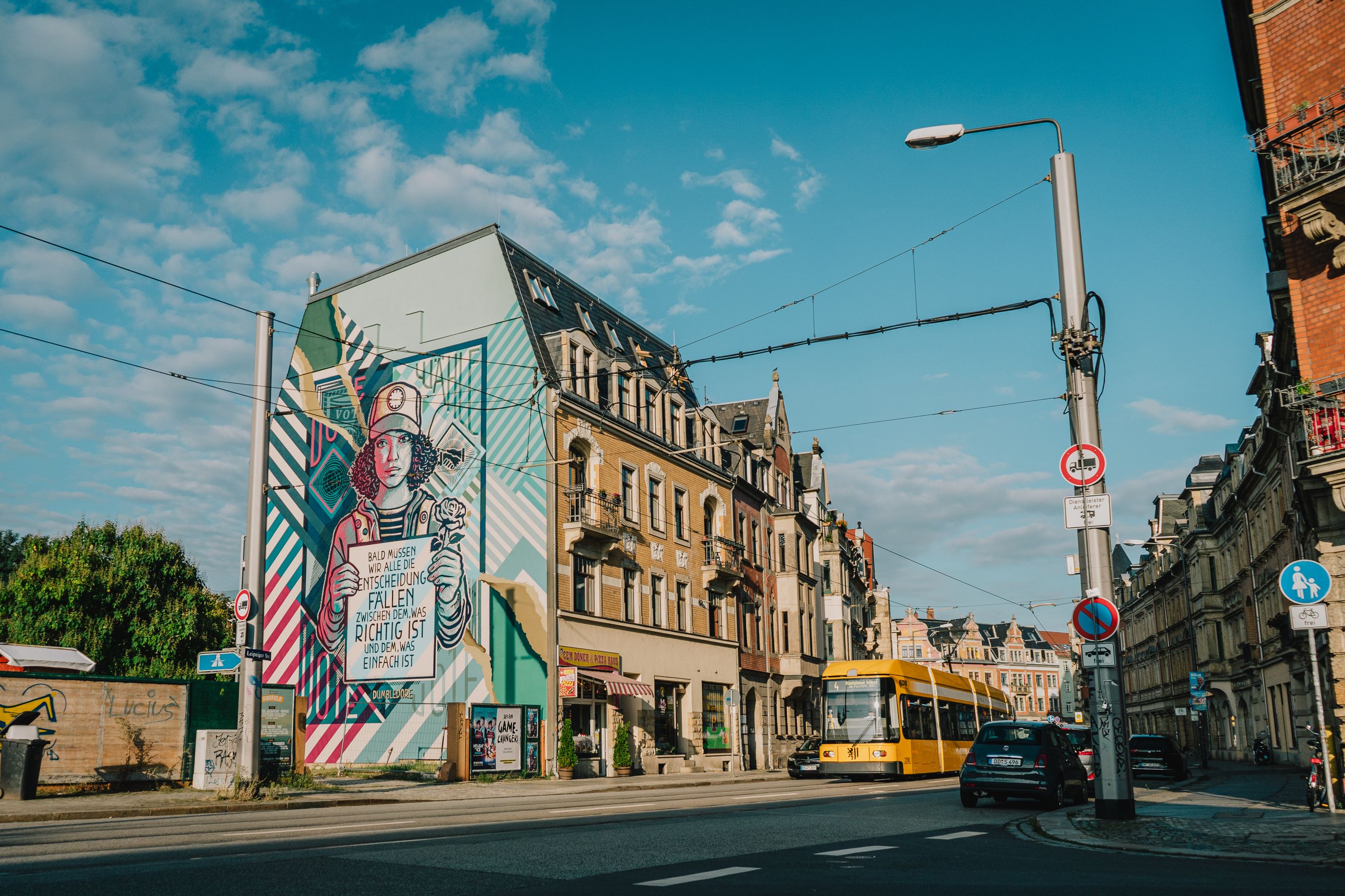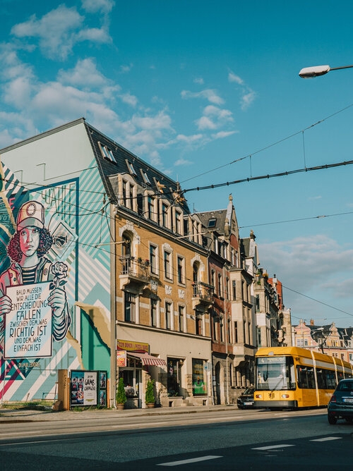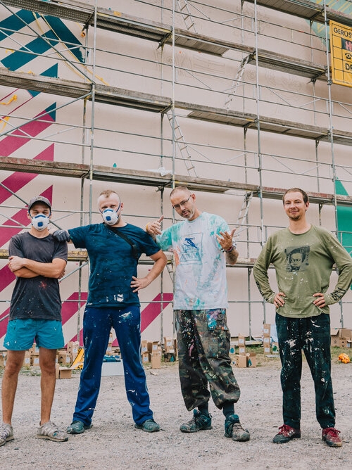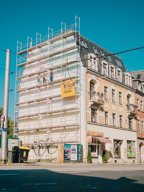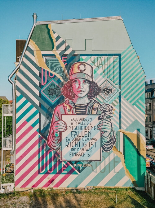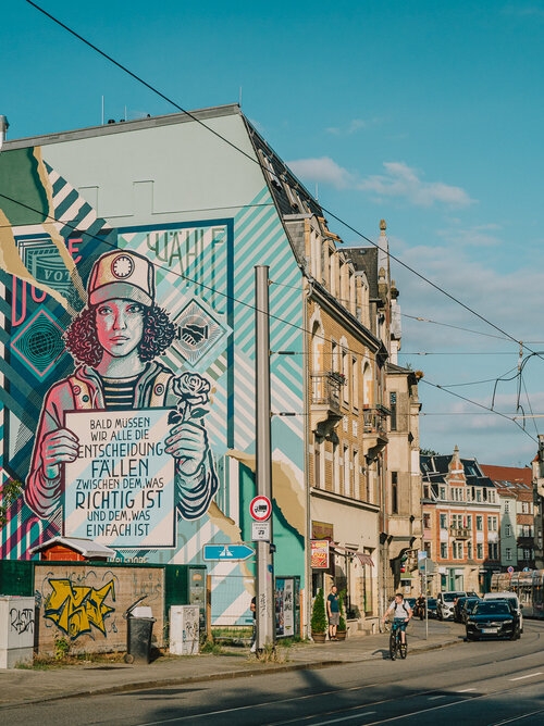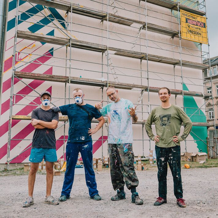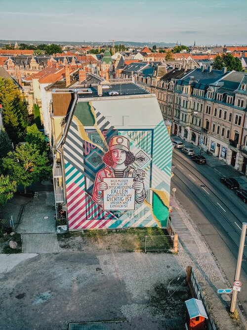 Gut zwei Wochen, dann war das Motiv an der neuen Wand an der Leipziger Str. 232 in Dresden fertig. Das 13 x 17 Meter große Motiv wurde von einem internationalen Künstlerkollektiv aus Deutschland, Polen, der Ukraine und Russland gestaltet und ist nach wie vor noch an der Fassade zu sehen.