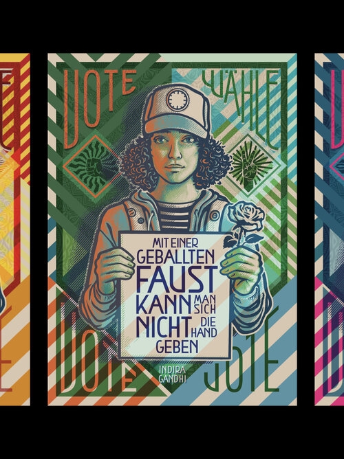 Nach fruchtbaren Gesprächen entstand die Idee, das Motiv aus 2019 weiterzuentwickeln. Das Kind vom 2019er Motiv ist nun älter. Schaut direkt zu dir und hält einen deutlich lesbaren Spruch klar in der Hand.