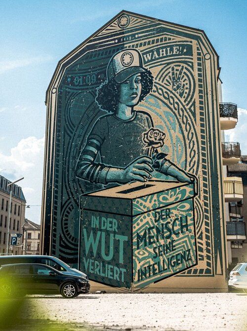 Und da waren fünf Jahre schon wieder rum. Nach unserem Engagement zur Landtagswahl 2019 mit unserem größten Wahlplakat Sachsens kam ganz schön Wirbel auf. Als die Landtagswahl 2024 anstand, haben viele gefragt, ob wir wieder was machen wollen. Klar wollen wir. Aber wie und mit welchem Einsatz können wir uns diesmal einbringen? Wir wollten an die vorherige Aktion anknüpfen und kamen nicht drumherum, wieder mit einer Mural-Idee auf den Künstler des letzten Murals zuzugehen. Lars P. Krause – du hast was im Posteingang.