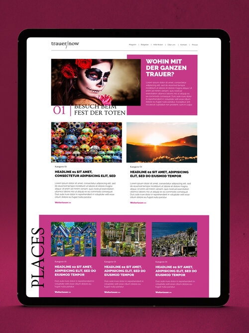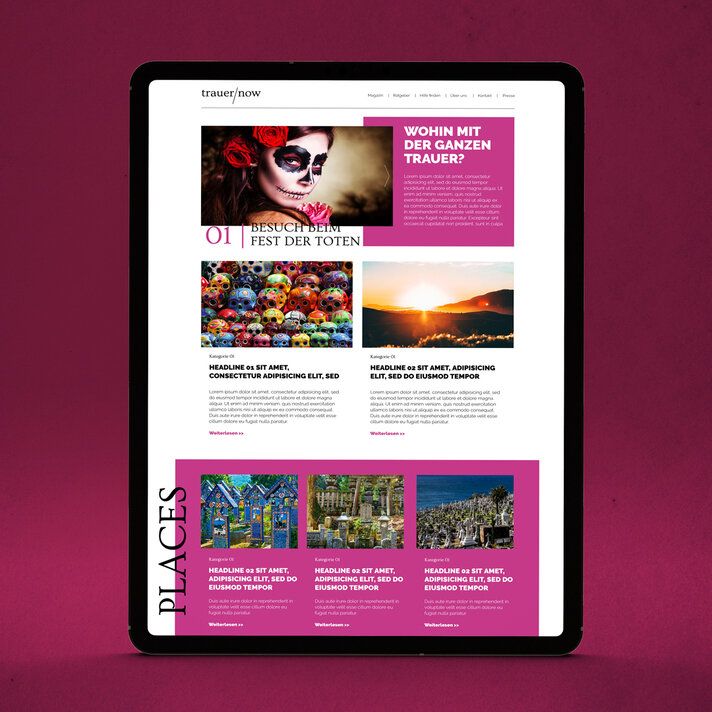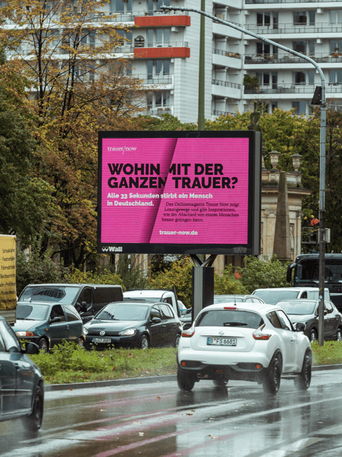Wie sieht so eine Kampagne aus? Dunkel? Nö. Uns war es wichtig, die Stories rund um Trauer in den Alltag zu platzieren. Pink als Farbe gibt hier der Kampagne daher Lautstärke und eine frische Optik. Das Keyvisual ist ein Querstrich. Er steht für einen Bruch im Inneren, den Trauer erst hervorbringt, der langsam heilen muss.