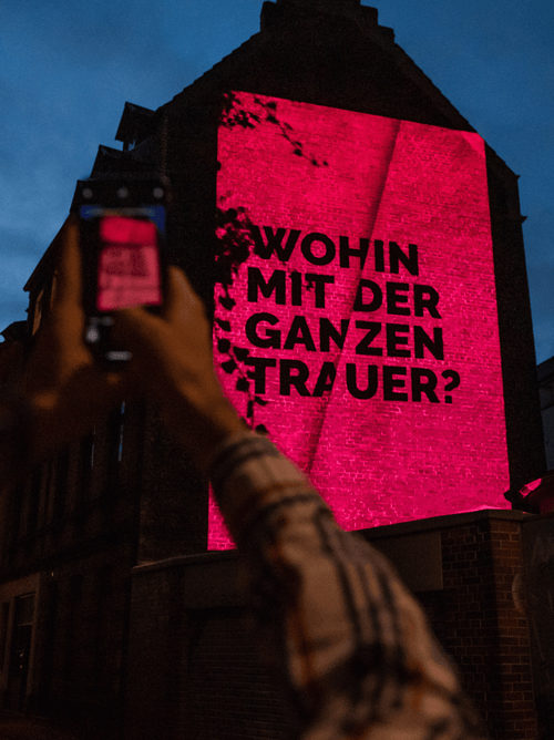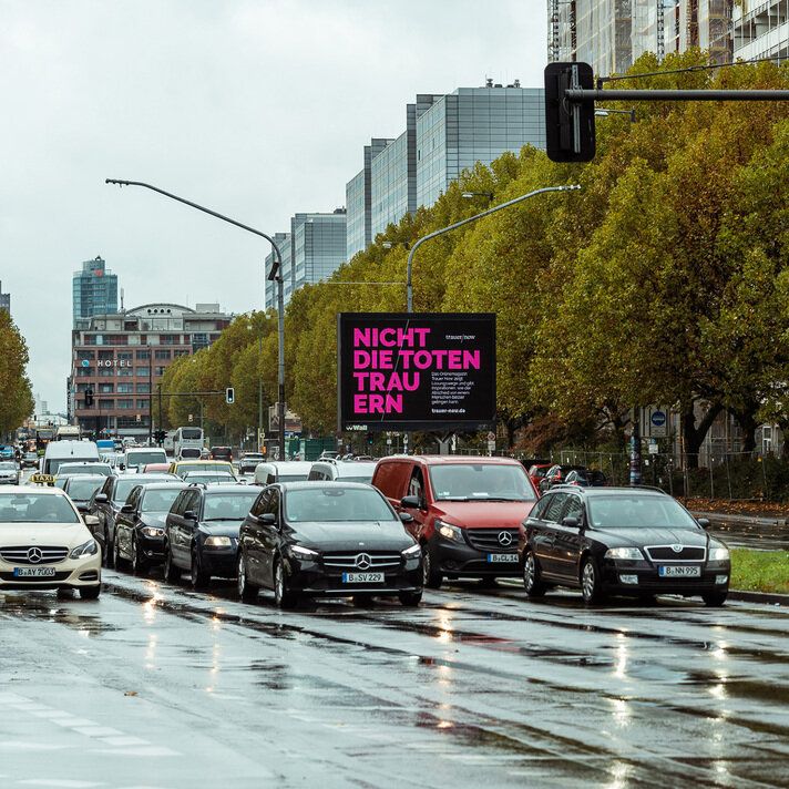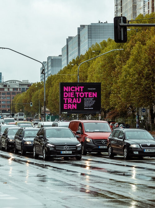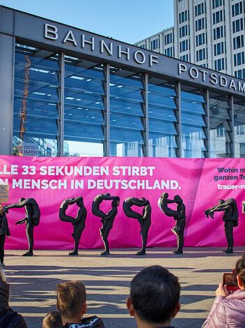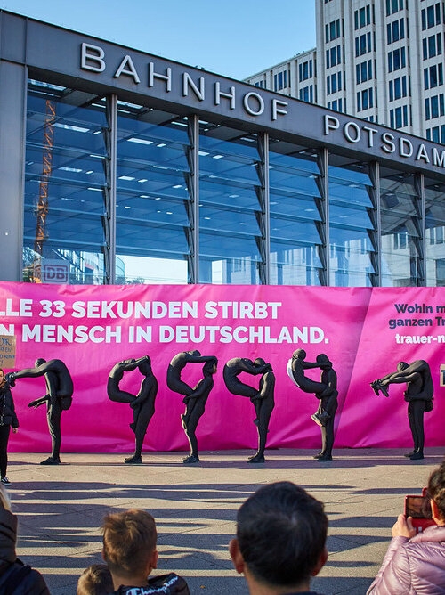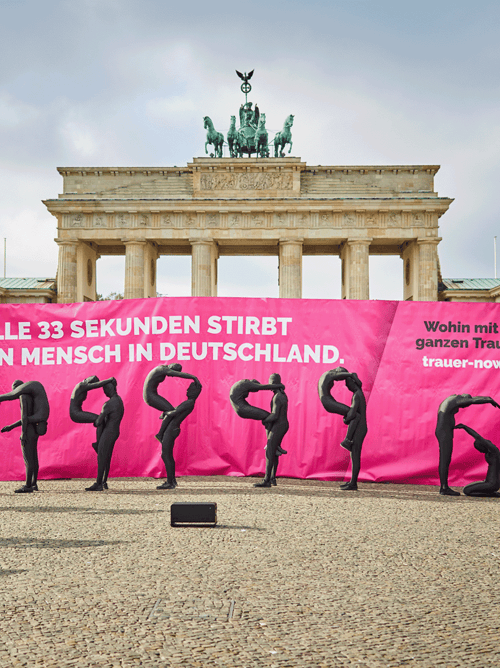 Mit einem Stunt brachten wir das Magazin auf die große Bühne. In Berlin, konnte man zusehen, wie die menschliche Sterbeuhr als medienwirksame Kunstaktion von Akrobaten alle 33 Sekunden eine neue Zahl bildete. Begleitet wurde die menschliche Sterbeuhr lautstark von einer Demo, die das Recht zu Trauern einforderte. Abgerundet wurde die Kampagne durch eine deutschlandweite Schaltung von Plakaten und digitalen Citylight-Postern im Herzen Berlins. Ein weiteres visuelles Highlight waren die Guerilla-Projektionen der digitalen Sterbeuhr auf Häuserfassaden in Berlin, Köln, München, Hamburg und Frankfurt.